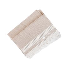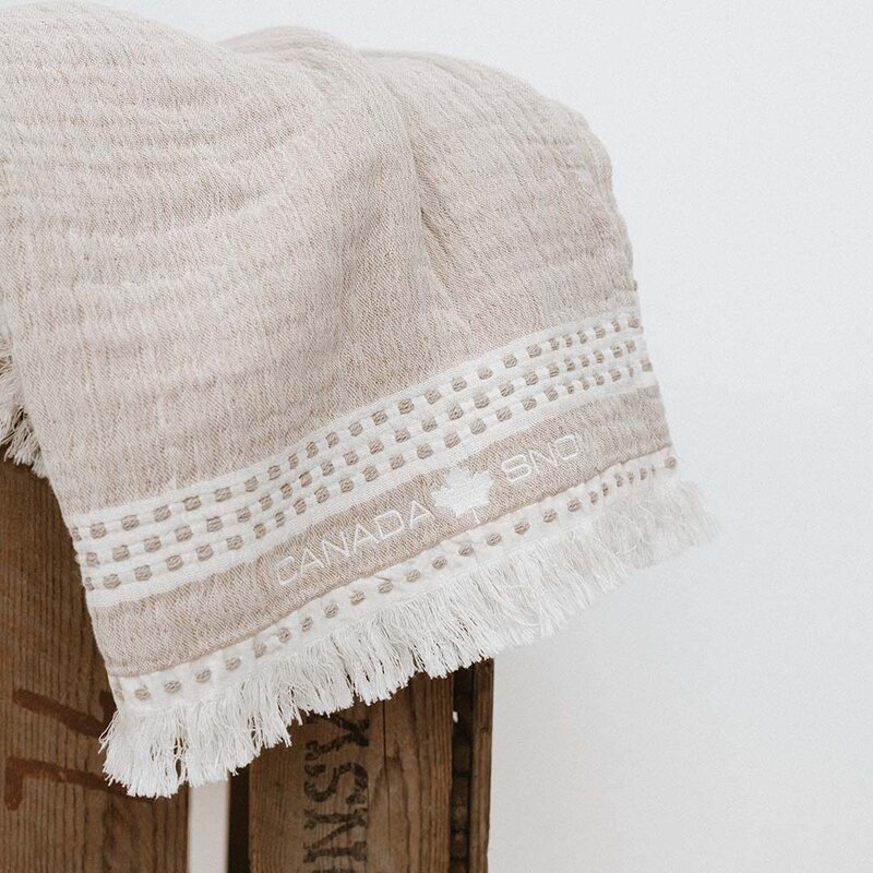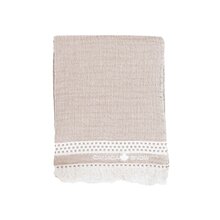 Nala, pläd från Canada Snow i 100% bomull. Vävd beige bomull med dekorativ invävd bård och logo i ljusare beige samt frans. Bredd 130cm Längd 170 cm. Tvättas i 30º.Tillverkad i Portugal.