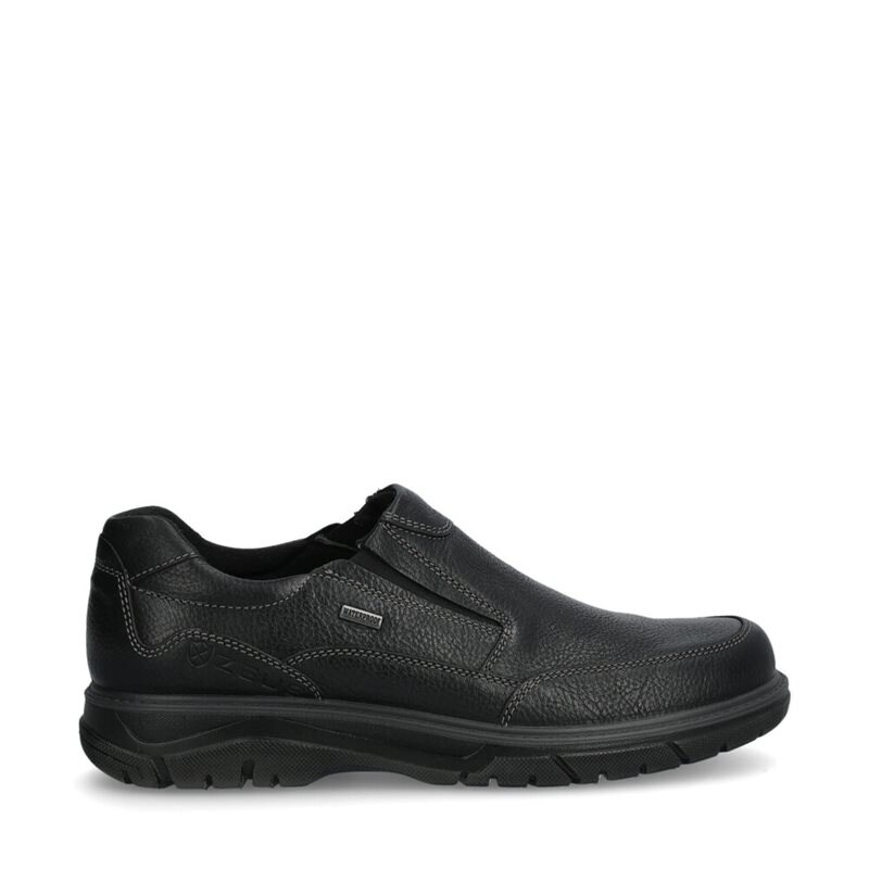 Barthes från Zeus - vattentäta lågskor i slip-on design. Ovandelen är tillverkad i svart skinn och är designad med vattentätt membran, rundad tåform och resårpartier i fotöppningen för ett enklare insteg. Skorna har ett innerfoder i textil som kombineras med en uttagbar innersula - perfekt för dig som önskar en bredare läst eller har egna inläggssulor. Modellen vilar på en lätt och stötdämpande yttersula i greppvänligt gummi.