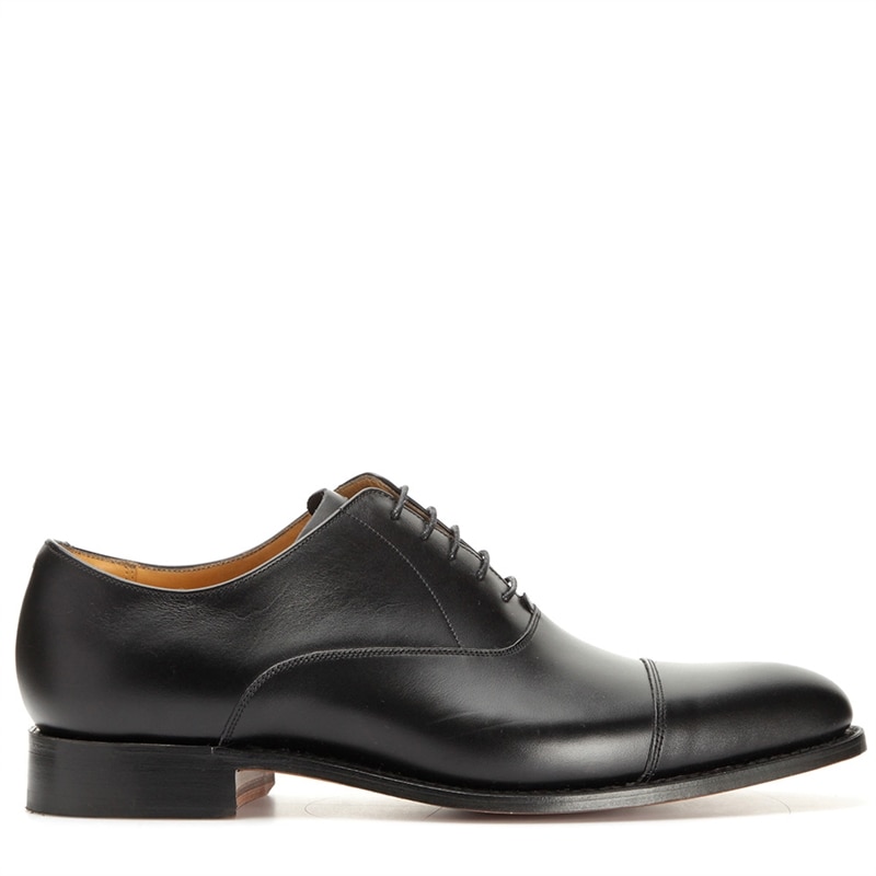 Duxford från Barker, dressade lågskor i oxfordmodell. Ovandel i fint svart kalvskinn, helt fodrad i skinn och randsydd yttersula i läder. Dessa skor är ett hantverk från engelska Barker, som tillverkat skor i England sedan 1880. En klassiker som passar alldeles utmärkt till bland annat mörk kostym. Säljs i UK Herr-stl.