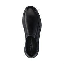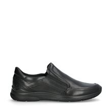 Irving, slip-in skor i svart skinn från Ecco med resår på sidorna för lättare insteg och bekväm passform. Vadderad runt bakkappan. Lätt sula med Ecco Fluidform, uttagbara innersulor i textil.