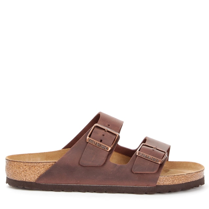 Arizona, klassisk modell från Birkenstock i oljat, brunt nubuck med kopparfärgade spännen. Mockaklädd korkfotbädd. Fotbäddens utformning ger dig maximalt stöd och avlastning för knän och rygg. Normal läst som ger fin passform åt dig med normala, eller lite bredare fötter.