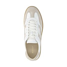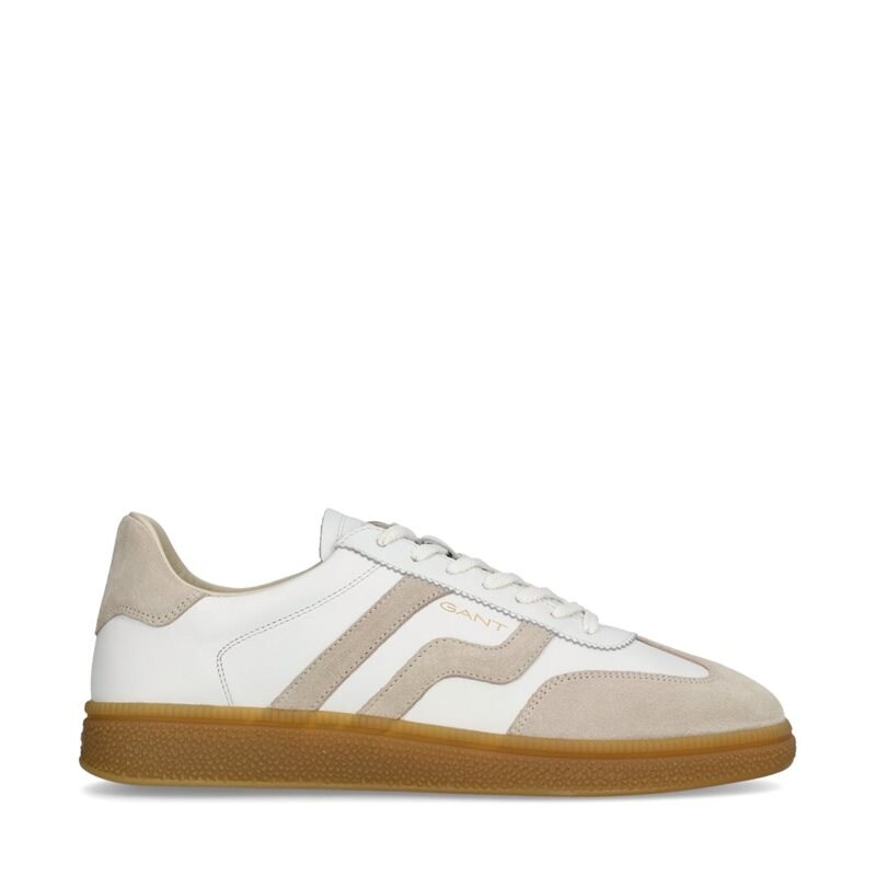 Cuzmo från Gant - retroinspirerade sneakers med låg profil och snygga mockadetaljer. Ovandelen är tillverkad i vitt skinn med beige mockapartier som skapar en sportig och snygg kontrast. T-toe sömmen i front ger skon extra karaktär. Innerfoder i textil som kombineras med en uttagbar innersula i skinn för optimal komfort, samt anpassning. Låg honungfärgad yttersula i gummi som fulländar en avslappnad retrostil.