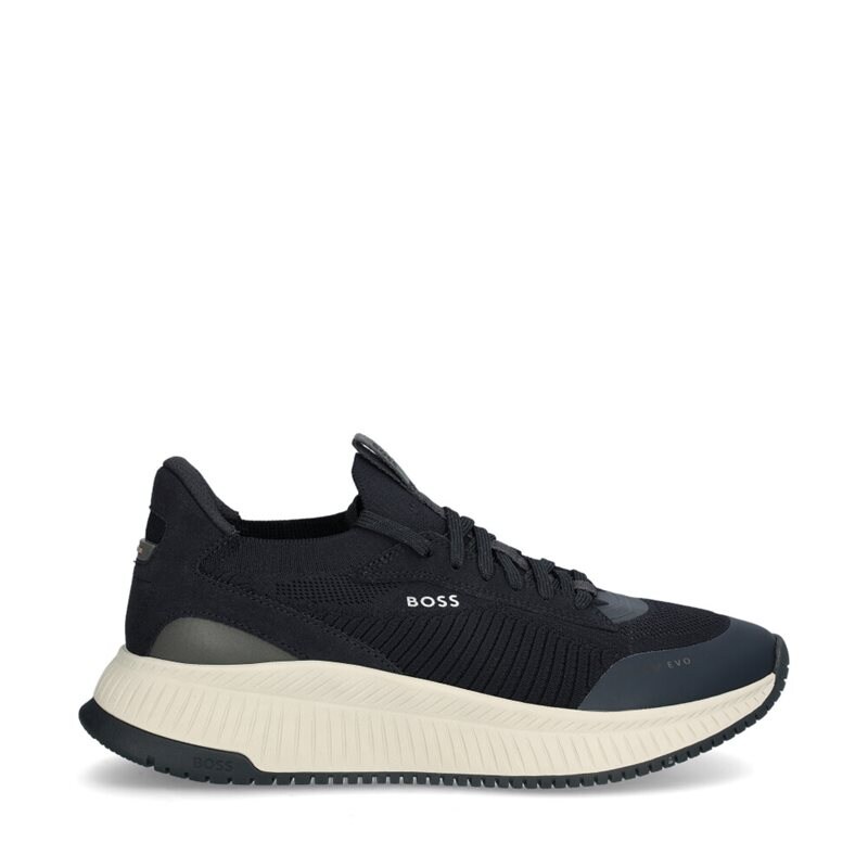 Evo Slon, sneakers från BOSS i blått, delvis återvunnet material, Slip-on sneakers med en sockliknade konstruktion som sitter bra på foten. Ovandel i mörkblå textil och yttersula i beige gummiblandning med svart slitsula.