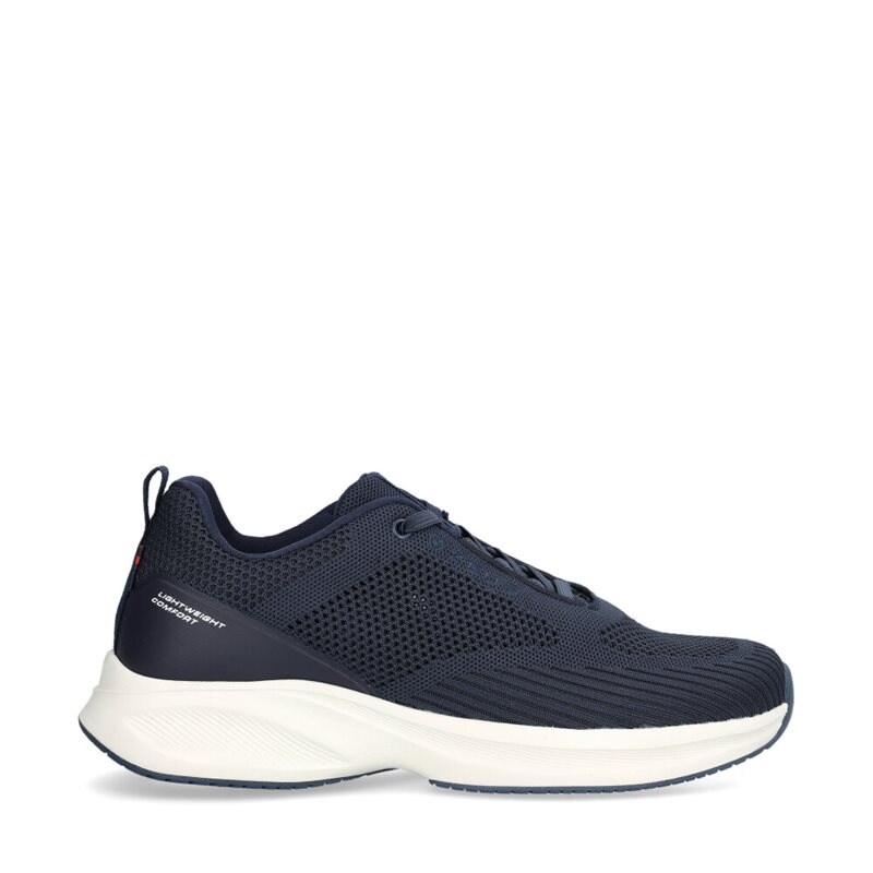 Icarus, sneakers med ovandel i vävd marinblå, färgad textil med diskret mönster. Andas och är bekväm på foten. Fodrade med textil. Uttagbara innersulor med memoryf foam. Yttersula i vitt lättviktsmaterial med gummidetaljer för bra grepp.