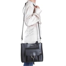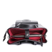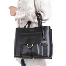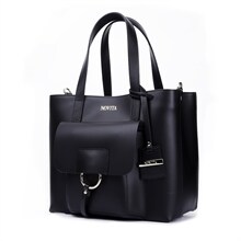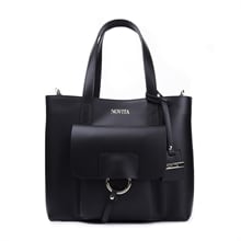 Marina, mellanstor väska från Novita i svart, italienskt Ruga-läder. Väska med handtag i läder och en ficka på utsidan med dekorativ guldfärgad metallring. Justerbar och avtagbar axelrem. Fodrad med röd textil, mittfack med dragkedja och ett sidofack som stängs med blixtlås. Platt botten med metallnitar som skyddar mot slitage. Mått (cm) H:23 (utan handtag) B:27 D:15.