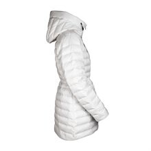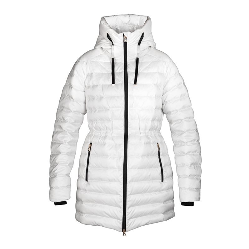 Leila, quiltad medellång dunjacka från Canada Snow. Lätt figursydd modell som är något längre baktill, dragsko i midjan. Tvåvägsdragkedja framtill, stor huva med dragsko, två ytterfickor med dragkedja. Vattenavvisande glansigt, vitt yttertyg i nylon/polyester, fodrad med polyester, fyllning 90% dun och 10% fjäder.