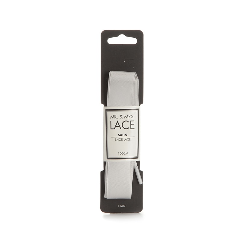 Grå skoband i satin. 1 par. Längd 100 cm, bredd 2 cm.