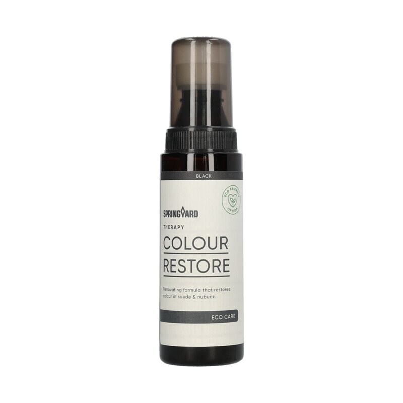 Colour Restore är en vattenbaserad, skonsam skokräm för svarta skor som fräschar upp mocka och nubuck, återställer färg och lyster och motverkar uttorkning. Den ger en lätt vattenavstötande effekt och lämnar efter sig en fräsch, naturlig doft med inslag av timjan. Innehållet är noggrant utvalt med hänsyn till både miljö och hälsa. Använd regelbundet för att förlänga skornas livslängd. Finns i flera färger och är PFAS-fri. Volym: 120 ml. Bruksanvisning: Skaka flaskan, tryck applikatorn lätt mot ytan för att frigöra vätska, applicera jämnt och låt lufttorka. Avsluta med mocka- eller nubuckborste. Testa alltid på dold yta först.