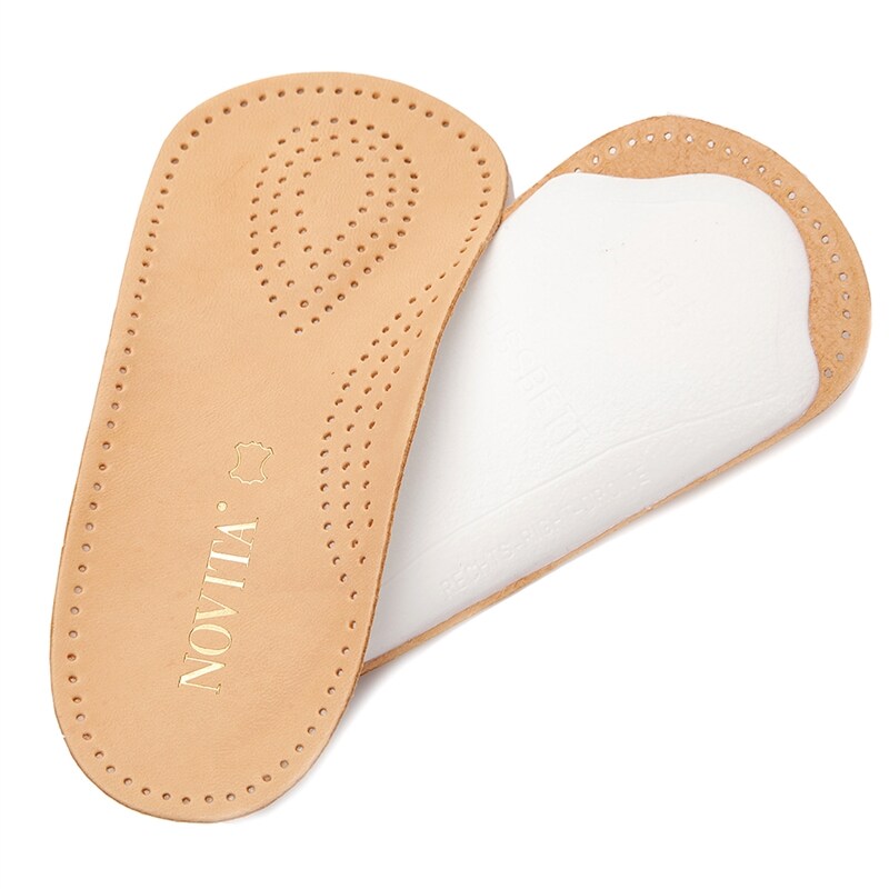 3/4 sula i läder som ger stabilt hålfotstöd. Med förfotspelott och dämpning för hälen. Tar mindre plats i skon. Självhäftande häl.