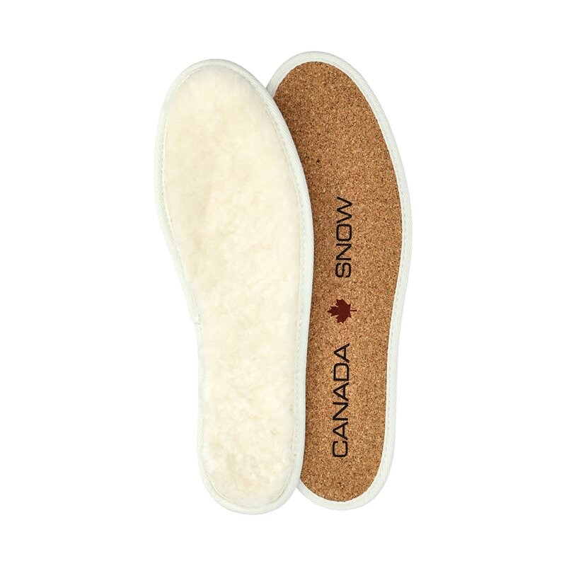 Fårskinnssula från Canada Snow i äkta fårull med kork på undersidan av sulan.