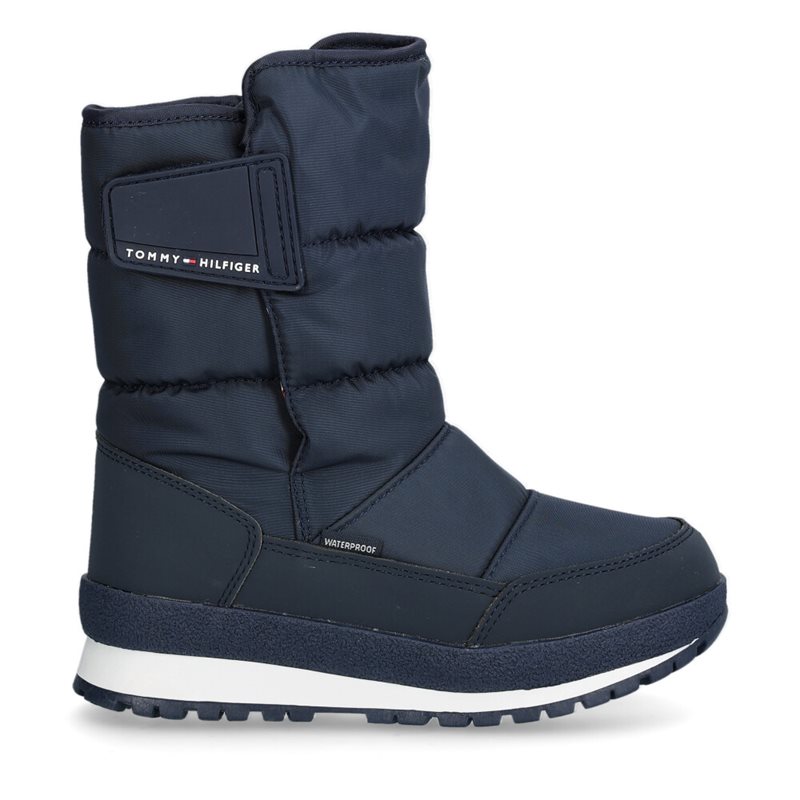 Snow boot, barnkängor från varumärket Tommy Hilfiger. Ovandel i marinblå textil med ett varmt innerfoder i polyester. Skorna är tillverkade av vattentätt material och stöter bort både väta och fukt under kalla vinterdagar. Dragkedja på insidan för ett enkelt insteg. Dekorativ karborrestängning längs skornas yttersida med stilren logo-detalj. Mönstrad yttersula i gummi som ger ett bra grepp på hala underlag.