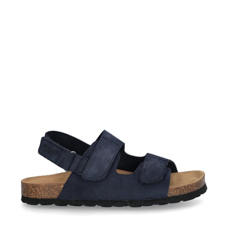 Barn- och juniorsandaler från Sweek i mörkblå nubuck. Två remmar över foten som justeras med kardborreband, och en reglerbar hälrem som gör att sandalerna sitter riktigt bra på foten. innersula i mocka och korklädd kant. Bekväma slip-in sandaler med yttersula i EVA. Handgjorda i Spanien. Perfekta sandalen till att bära utomhus under sommardagarna och inomhus på förskola och skola.